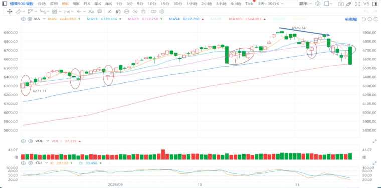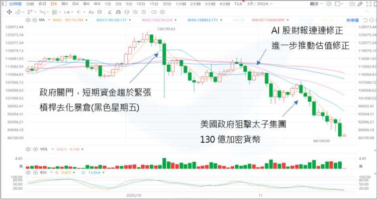 →11/20 美股反轉開高走低,雖與輝達財報質疑有關,但一舉重挫,下行波動如此之大,本質還是與加密貨幣弱勢,持續破底暴倉有關。最投機的商品無法止跌,擴大了估值修正的賣壓。