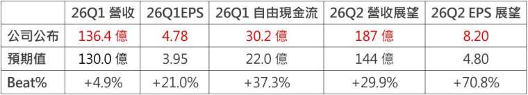 營運現金流 84.1 億,資本支出 53.9 億,繳出自由現金流的 30 億好成績,2026 財年的資本支出,從 180 億上調至 200 億,這並不會太高,是很合理的數字,因為這代表下面三季,將僅持平於調高後的 26Q1 資本支出,這是看見通用記憶體報價狂飆,HBM 持續投入的合理因應策略,預期在報價趨緩前,自由現金流仍會保持季增。
