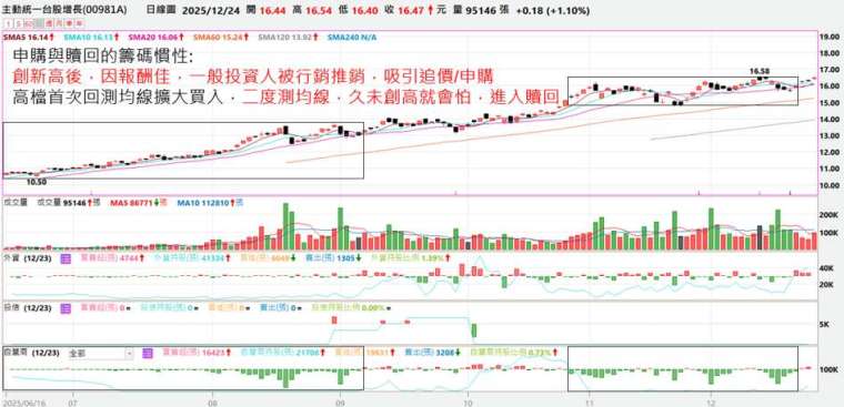 這會對於既有已被大量持有的 AI 標的,12/15~18 下檔回測均線僅止季線的相對下檔保護主因,這時就剛好是 00991A 的建倉買盤期間。並且後續上市後 1~2 個交易日也有部分助漲買盤的推升作用。