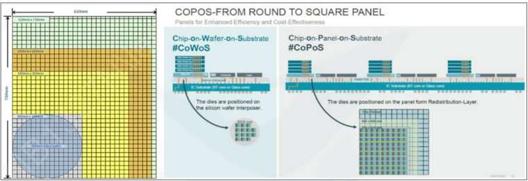 CoPoS 可理解成 CoWoS 與 FOPLP(面板級扇出型封裝)的結合,其實 FOPLP 此技術已經存在,但並沒有用到中介層,這主要是 AI 信號高速傳輸所必需的,因此將 CoWoS 中介層材料改採玻璃面板,,以方形的面板取代原先圓形的矽中介層,兩相結合成為了 CoPoS