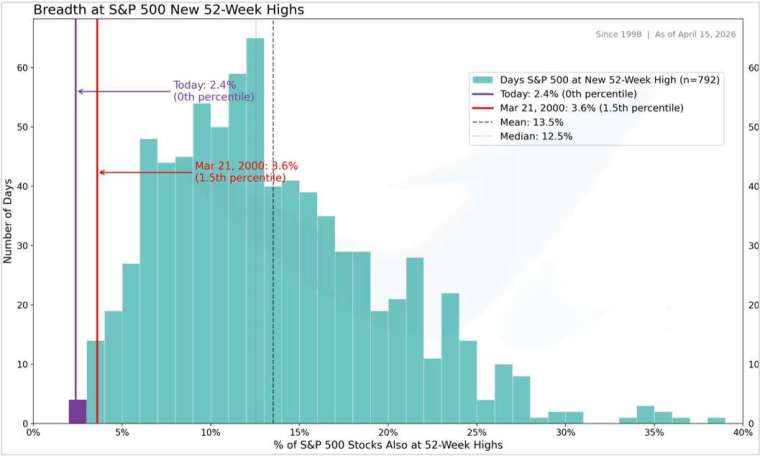 美股在 CSP 廠商強力跌深反彈,加上已經創高的費半,帶動 S&P500、Nasdaq 終於回到歷史新高,Nasdaq 連續 12 個交易日收漲,創下自 2009 年以來最長連漲紀錄!而與此同時,關於市場廣度的難堪紀錄也誕生,在大盤處於歷史新高的交易日中,S&P500 處於 52 週 (一年) 新高的家數,僅有 2.4% 也就是 12 家,是 1998 年來的最低數值。