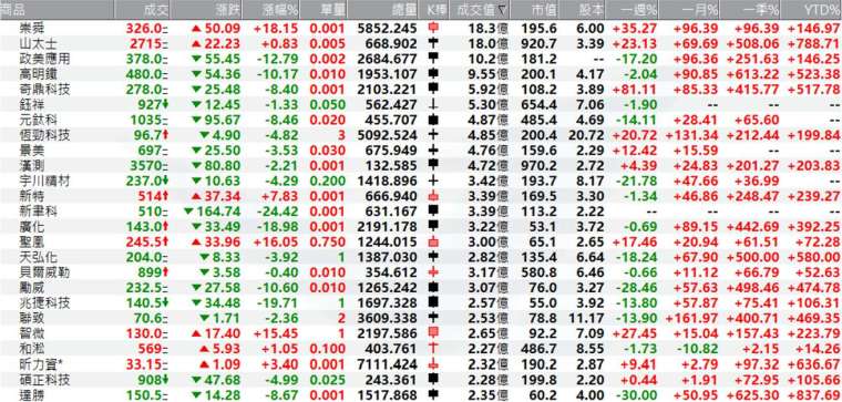興櫃股無漲跌幅限制,且大多隸屬於光通訊 CPO、半導體設備耗材兩大次族群,因此當投機氣氛擴張時,資金轉進興櫃,先前不時單日漲超過 10%,甚至被反過來利用成為利多題材,轉為當作當日上市櫃同產業類股比較補漲的標的。如上圖所示,以成交值降冪排序,熱門興櫃股的單季、YTD(今年以來) 漲幅都非常驚人,這是行情過熱與融漲的信號之一。
