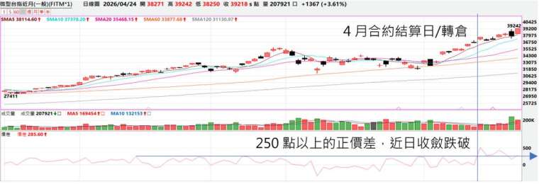 上圖,則說明異於過往超過 250 點的正價差,意味者強勢軋空。而近期盤中動盪,正價差開始收斂,可以視為投機資金先卡位,現股持續上漲,期貨部位開始獲利調節的某種體現。