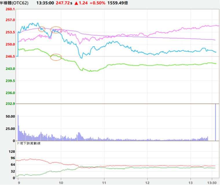 粉紅: 台指期;藍線: 上櫃半導體;綠線: 小型 300 指數